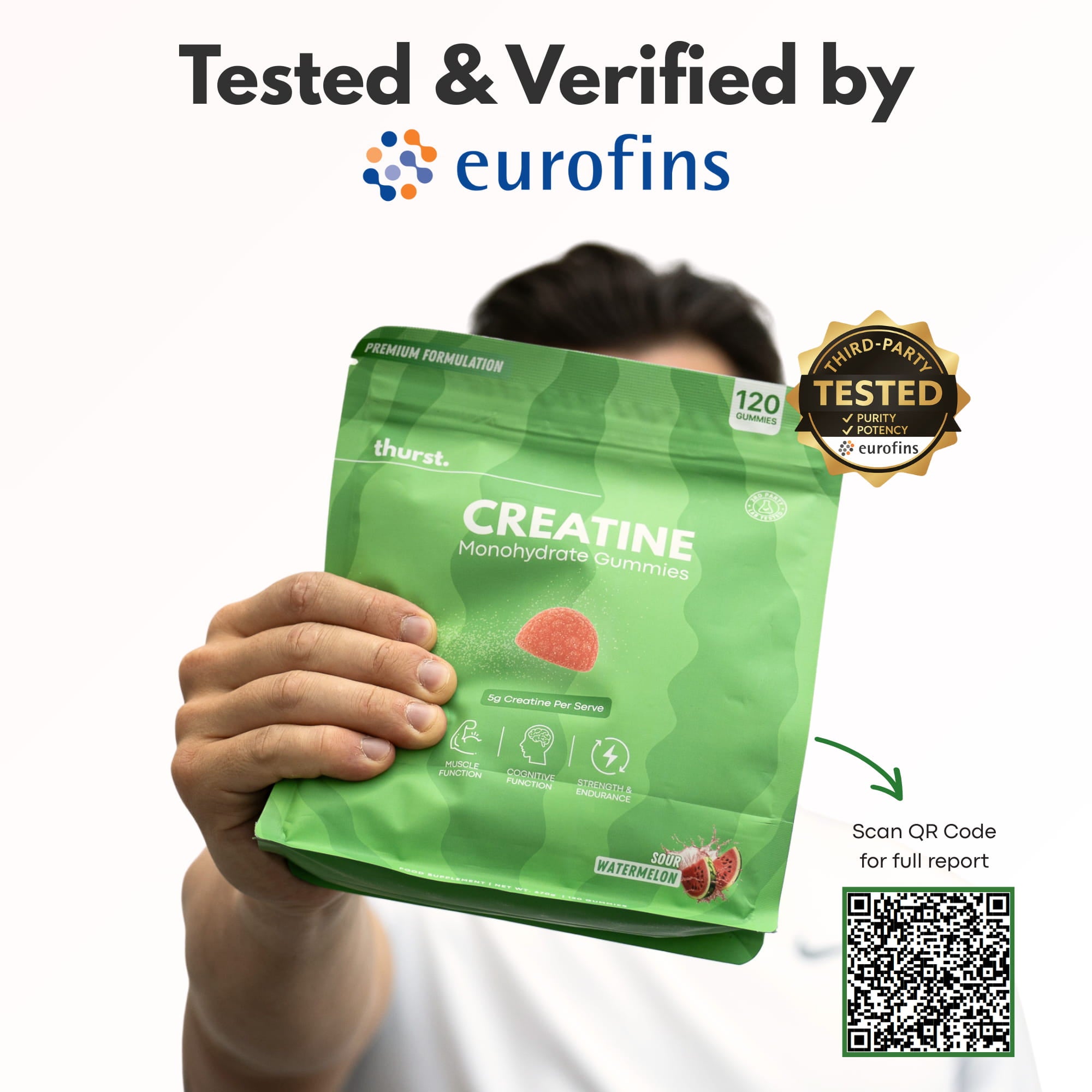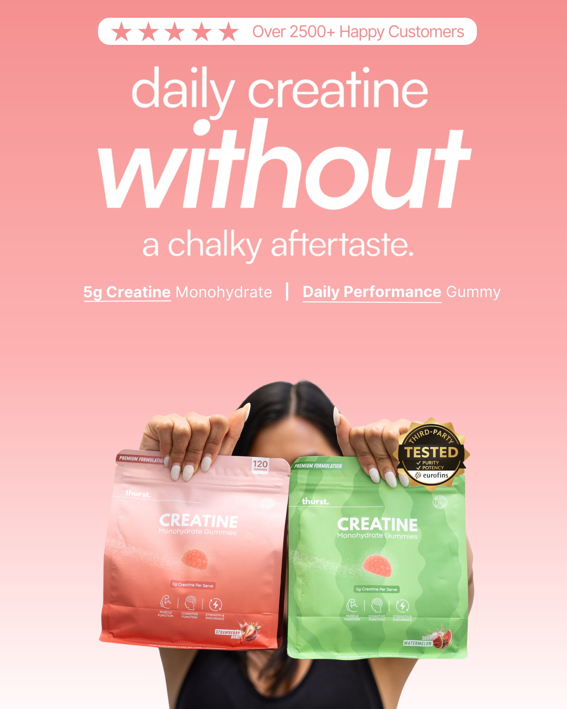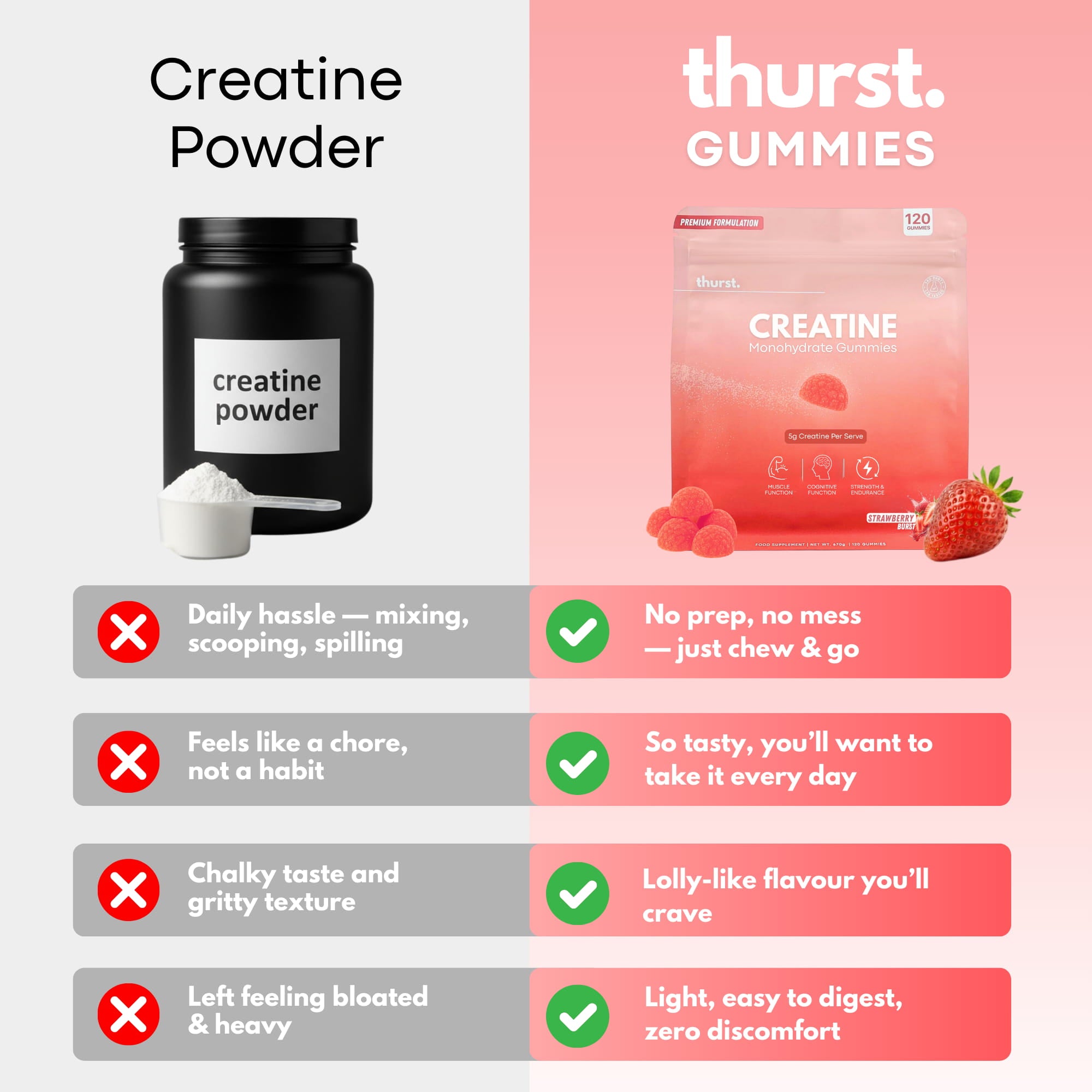 No more messy powders. Thurst Gummies provide 5g of creatine per serving in a simple, delicious way.